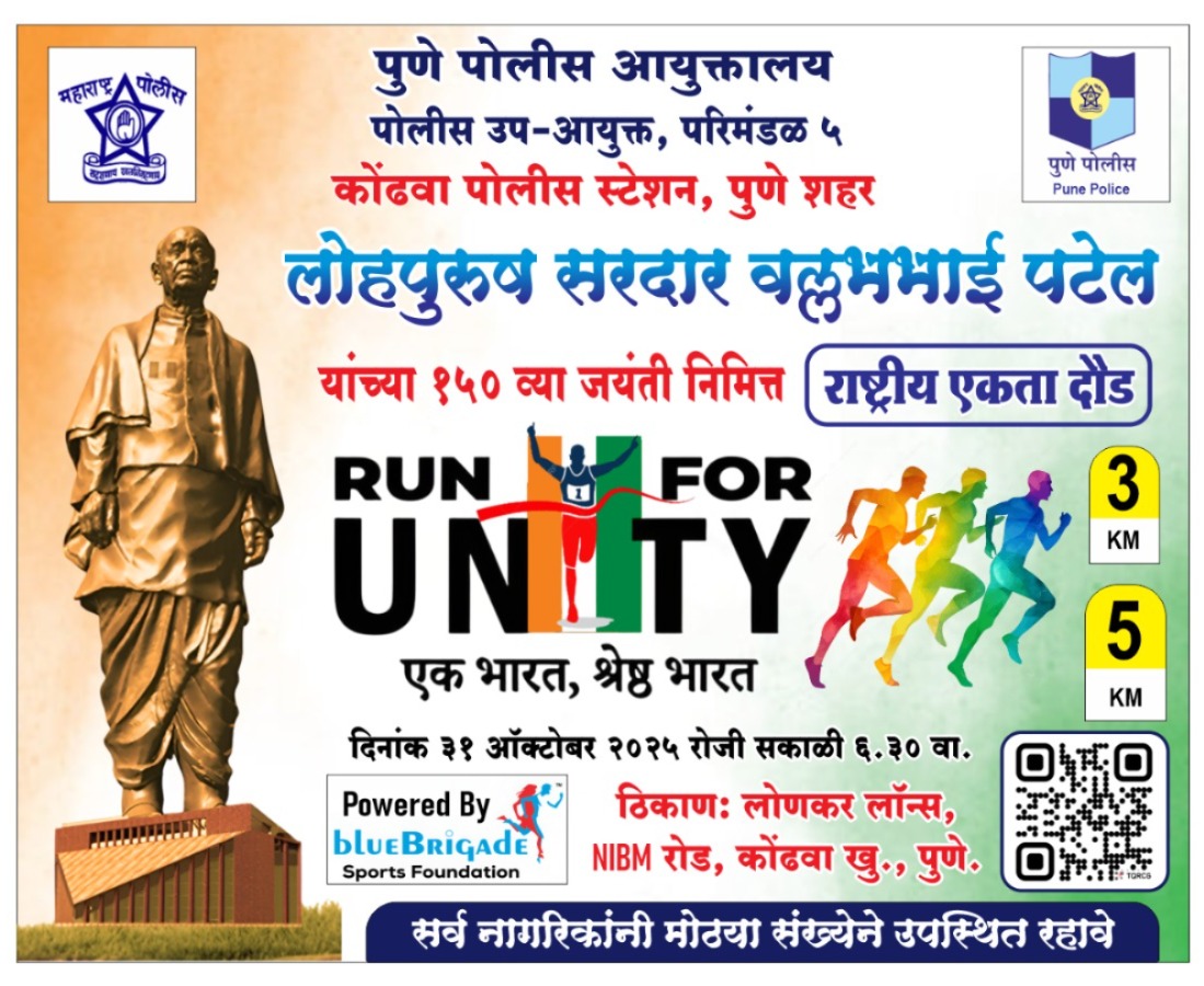 तरी सर्व नागरीकांना आवाहन करण्यात येते की, ३१/१०/२०२५ रोजी सकाळी ०७.०० वा. लोहपुरूष सरदार वल्लभभाई पटेल यांची १५० वी जयंतीच्या अनुषंगाने राष्ट्रीय एकता दौंड (RUN FOR UNITY ) चे मॅरेथॉनकरीता लोणकर लॉन्स, एनआयबीएम रोड, पुणे येथे मोठया संख्येने भाग घेण्याचे आवाहन करण्यात येत आहे.