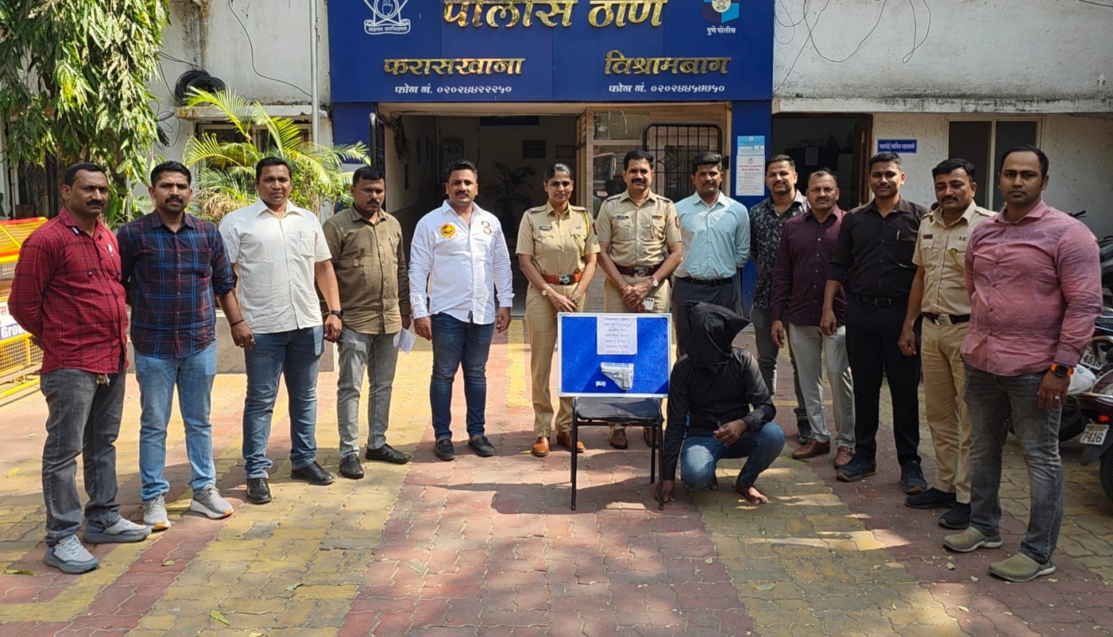 दि. १८/०४/२०२५ विश्रामबाग पोलीस ठाणे तपास पथकातील पोलीस अंमलदार अनिस शेख यांना मिळाले बातमी वरुन फुटका बुरुज, शनिवार वाडा, शनिवार पेठ, पुणे येथील सार्वजनिक रोडवरुन इसम नामे आकाश दशरथ घोणे वय ३० वर्षे धंदा मटन शॉप रा. ९३३ भवानीपेठ, रामोशी गेट समोर, बक्कर कसाब मस्जिद मागे पुणे यास विश्रामबाग पोलीस ठाणे तपास पथकातील अंमलदार यांनी ताब्यात घेऊन झडती घेतली असता त्यांच्या ताब्यात अंदाजे ५०,०००/- रुपये किंमतीचे गावठी पिस्टल व एक काडतुस मिळुन आल्याने त्यांच्यावर विश्रामबाग पोलीस ठाणे येथे भारतीय शस्त्र अधिनियम कलम ३, २५ व महाराष्ट्र पोलीस अधिनियम कलम ३७ (१) (३) सह १३५ गुन्हा नोंद करण्यात आलेला असुन पुढील तपास पोलीस उपनिरीक्षक मनोज बरुरे करीत आहेत.