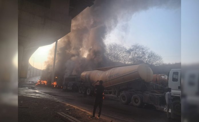 शुक्रवारी सकाळी भिलवारा, राजस्थानमध्ये एक मोठा अपघात झाला. जिल्ह्यातील मंडलगडच्या लाडपुरा छेदनबिंदूवर वेगाने येणार्या सिमेंट टँकरने पुढे जाणा tan ्या टँकरला धडक दिली. टक्करमुळे, तीन गाड्यांमध्ये प्रचंड आग लागली आणि त्या जागेवर अनागोंदी निर्माण झाली. टँकर चालकास आगीने धडक दिली आणि जिवंत जाळले आणि दुर्दैवाने त्याचा मृत्यू झाला. अपघातानंतर महामार्गावर एक लांब जाम होता, ज्यामुळे वाहतूक कोंडी होते.